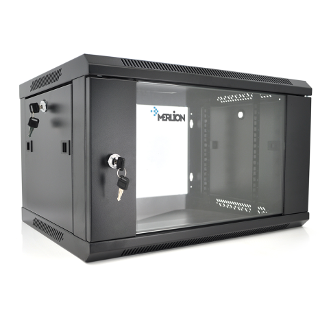 Шафа Merlion 6U. Привабливий зовнішній вигляд, двері із загартованого скла, непомітний чорний колір. У верхній кришці шафи передбачено місце для встановлення вентилятора охолодження. Зовнішня висота складає 367 мм, зовнішня глибина – 450 мм. Бічні двері – знімні на замках. Передні двері із загартованого скла з наявністю замку для запобігання небажаному доступу до обладнання.