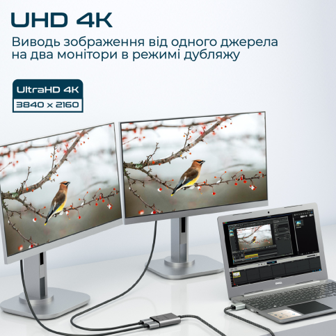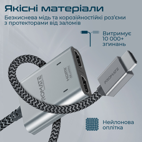 Promate MediaSplit-H2 - компактний HDMI розгалужувач, який дозволяє вивести картинку з одного джерела на два екрани з роздільною здатністю 4K UHD 60 Hz без перешкод та втрати якості.