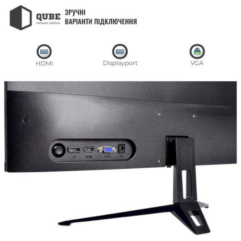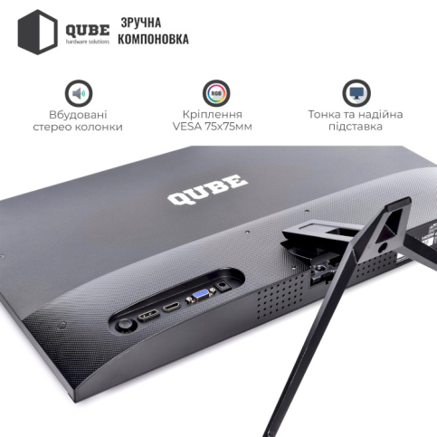 Монітор 24.5" QUBE B25F100-IPS пропонує широкий вибір під'єднань, включно з HDMI, VGA і DisplayPort, що дає змогу легко під'єднувати різні пристрої без потреби використання додаткових адаптерів. Крім того, наявність вбудованих динаміків робить цей монітор універсальним рішенням для тих, хто цінує порядок на робочому місці і не хоче піклуватися про підключення зовнішніх колонок.