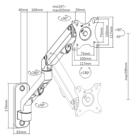 За допомогою системи прокладання кабелю, можна зібрати всі кабелі разом, організувавши порядок на робочому місці. Завдяки спеціальному пружинному механізму можна самостійно налаштовувати оптимальну позицію – нахил (+90° ~ -45°) та поворот (±90°).