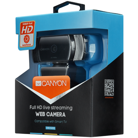 За допомогою цiєї веб-камери Canyon ви отримаєте чiтке та рiвне зображення з великою кiлькiстю пiкселiв у режимi 30 кадрiв у секунду. Записуйте вiдео та проводите онлайн-стрiми навiть за тьмяного свiтла, ця вебкамера автоматично коректує налаштування при слабкому висвiтленнi. Гiдна якiсть вiдео забезпечується в 1080p full-hd роздiльнiй здатностi та 65- градусному широкому ракурсi. Функцiї автофокуса та придушення аудiошумов забезпечать безперебiйнi стрiм-сесiї. Камеру можна прикрiпити до штатива або приєднати до Smart TV.