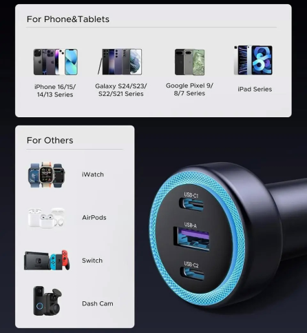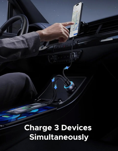 Пристрій оснащений двома портами USB-C і одним USB-A з підтримкою протоколів PD3.0, PPS, QC3.0, SCP, FCP та AFC. При індивідуальному використанні USB-C видає до 30 Вт, а USB-A — до 22.5 Вт. Сумарна потужність при підключенні трьох пристроїв сягає 22.5 Вт завдяки інтелектуальному розподілу енергії. Додатково є світлодіодна підсвітка для зручності в темряві, а сумісність охоплює автомобілі з напругою 12–24 В.
