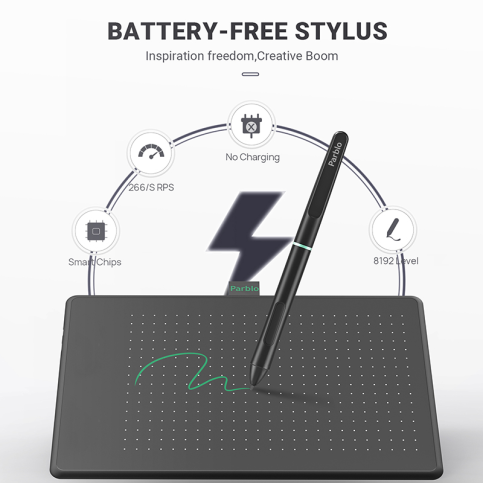 Забезпечує високу продуктивність завдяки швидкості відгуку 266 RPS, дозволу екрана 5080LPI та 8192 рівням чутливості до натиснення пера. Ви зможете контролювати товщину, прозорість та колір лінії легше й точніше. Висота читання пера складає 10 мм.