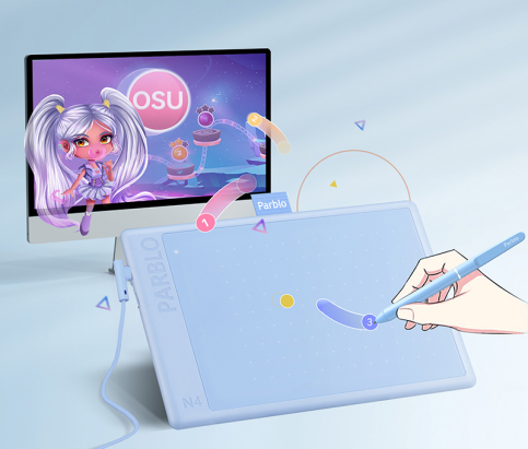 Parblo Ninos N4 — компактний графічний планшет з активною площею 4x3" дюймів. У ньому використовується бездротова технологія електромагнітного резонансного пера та підтримується можливість нахилу пера на ± 60°. Це чудовий вибір для того, хто бажає навчитися малювати.