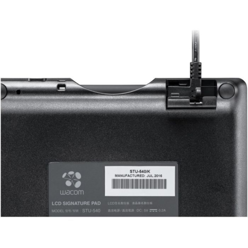 Перо Wacom можна приєднати шнуром до планшета, щоб воно не загубилося. STU-540 створений для роботи в місцях з високим скупченням людей, наприклад на прилавках магазинів і в системах контролю, але при цьому він відрізняється компактною конструкцією та надійністю, що дозволяє використовувати його де завгодно.
