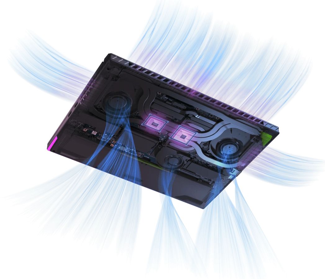 Щоб забезпечити стабільну роботу таких потужних компонентів, ASUS змінили конструкцію корпуса та материнської плати ROG Strix G18. Ноутбук умістив усередині новий радіатор на всю довжину корпусу, а щоб він краще відводив тепло, його ребра ще більше наблизили до вентиляційних отворів. Цей великий радіатор складається з трьох секцій, які оточують материнську плату з усіх сторін щільно розташованими ребрами загальною площею 187156 мм2. Така конструкція збільшує кількість маршрутів, якими нагріте повітря може залишити пристрій, та значно поліпшує загальну ефективність повітряного потоку. Нарешті, в той час як більшість ігрових ноутбуків мають два вентилятори для охолодження, розробники G18 додали третій вентилятор, який обдуває відеопроцесор і відеопам’ять, що дозволило їм ще далі посунути межі робочих характеристик пристрою. Доповнена сімома тепловими трубками, система охолодження G18 являє собою справжнє диво техніки.
