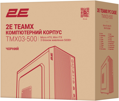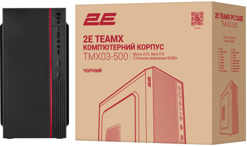 2E TeamX TMX03 — компактний корпус для настільного ПК. Підходить для збірки домашньої або офісної системи, а також бюджетної робочої станції середнього рівня. Корпус виконаний в типорозмірі Mini-Tower, підтримує встановлення материнських плат формфактора Micro ATX та Mini ITX.