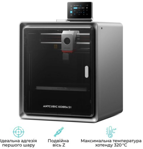 В основі принтера лежить перевірена технологія FFF/FDM/LPD, що дозволяє створювати об'єкти з товщиною шару ±0.2 мм та максимальною точністю. Підтримка широкого спектра матеріалів (PLA, ABS, ASA, PETG, TPU) робить Anycubic Kobra S1 універсальним вибором як для ентузіастів-початківців, так і для професіоналів. Потужний нагрівальний елемент розігріває сопло до 320 ° C, а стіл — до 120 ° C, забезпечуючи ідеальне зчеплення з моделлю навіть при використанні термостійких пластиків.