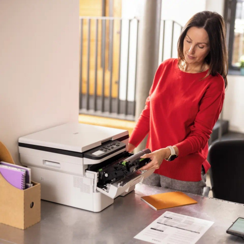 Серед ключових особливостей — місткий лоток на 250 аркушів, що зменшує потребу в частому поповненні паперу, і стартовий тонер на 2000 сторінок у комплекті, з можливістю заміни на картриджі до 5000 сторінок. Пристрій підтримує підключення через USB, що дозволяє друкувати з ПК та ноутбуків. Сканер із роздільною здатністю 1200 x 1200 dpi забезпечує якісне оцифрування, а функція копіювання підтримує масштабування від 25% до 400%.