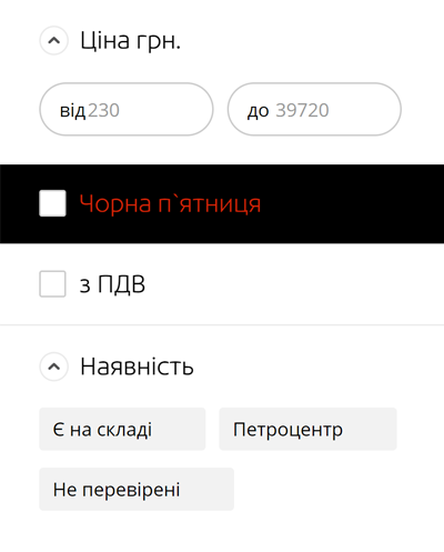 Все просто! У зазначений час з 27-го (з 10-00 ранку) до 29-го листопада 2025 року (до 15-00 години) на сайті будуть ВІДРАЗУ відображатись гуртові ціни (ТІЛЬКИ НА ТОВАРИ В НАЯВНОСТІ), а також, перебуваючи в будь-якому розділі каталогу товарів, Ви можете скористатися розміщеним у лівій частині сторінки фільтром «Чорна п'ятниця» (як вказано на рисунку праворуч), щоб відфільтрувати до показу лише товари з діючою акційною ціною.