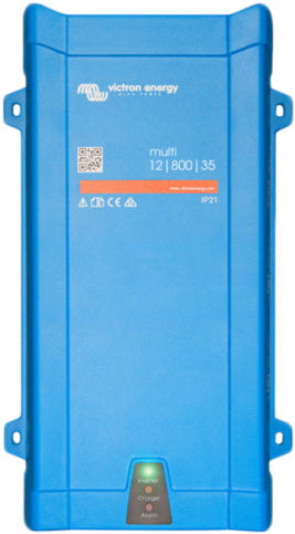 Багатофункціональний інвертор Victron Energy MultiPlus 12/800/35-16 з чистою синусоїдою на виході має у своєму складі багатоступеневий зарядний пристрій з адаптивною технологією заряду батарей і швидкодіюче трансфертне реле передачі змінного струму. Інвертор допускає як паралельні, так і 3-х фазні зміни. Інвертор має безліч налаштувань і одне програмоване реле.
