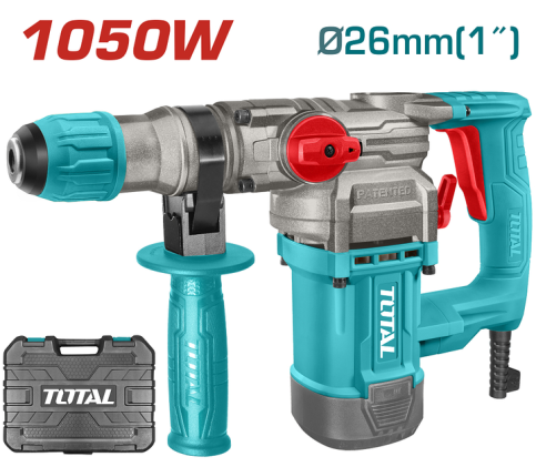 Перфоратор TOTAL TH110266 - потужний інструмент для свердління та довбання. Система кріплення оснастки для буріння: SDS-plus. Перфоратор працює в трьох режимах: свердління, удар + свердління, довбання. Однією з особливостей моделі є потужний двигун на 1050 Вт. Завдяки йому, енергія удару становить 4,5 Дж і ви можете свердлити отвори діаметром до 26 мм у бетоні, до 13 мм у металі та до 40 мм у дереві. Максимальна швидкість без навантаження - 1100 об/хв, максимальна частота ударів - 3800 уд/хв. Наявність запобіжної муфти оберігає оператора при випадковому заклинюванні бура. Вертикальне компонування сильно збільшує надійність і витривалість інструменту. Спеціально для зручності тривалих робіт рукоятка має гумову накладку. До комплекту поставки входять перфоратор, додаткова рукоятка, 3 бури, 2 зубила, обмежувач глибини, а також пластиковий кейс.
