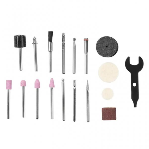 - Включає 26 різних насадок для шліфування, різання, різьблення, полірування та очищення