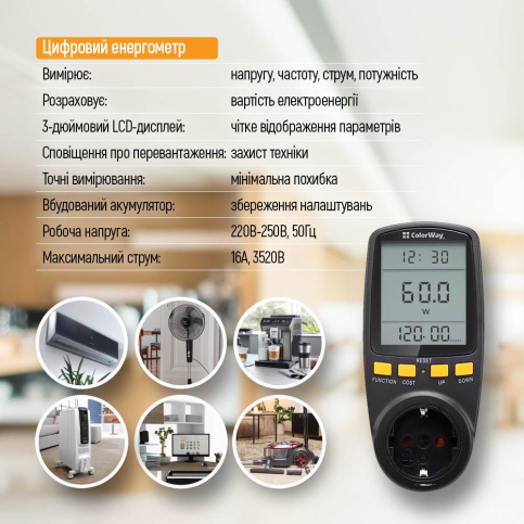 Цифровий ватметр (вольтметр) СolorWay для розетки (16A/3680W) c LCD дисплеем Black Цифровий енергометр ColorWay – це портативний лічильник електроенергії, який дозволяє вимірювати напругу, частоту електромережі, силу струму, потужність підключеного пристрою та підраховувати загальне споживання електроенергії за певний проміжок часу. Завдяки функції підрахунку вартості електроспоживання ви зможете ефективно контролювати витрати на електроенергію. 7 режимів відображення: Режим 1 – Час роботи / Потужність (Вт) / Вартість електроенергії Режим 2 – Час роботи / Сукупне споживання електроенергії (кВт·год) Режим 3 – Час роботи / Напруга (В) / Частота (Гц) Режим 4 – Час роботи / Струм (А) / Коефіцієнт потужності Режим 5 – Час роботи / Мінімальна потужність (Вт) Режим 6 – Час роботи / Максимальна потужність (Вт) Режим 7 – Час роботи / Вартість електроенергії (COST/kWh) Діапазон вимірювання: Час: 0 сек – 9999 днів Потужність: 0.0W – 9999W Напруга: 0.0V – 9999V Струм: 0.000A – 9999A Частота: 0Hz – 9999Hz Енергія: 0.000KWh – 9999KWh Вартість: 0.00 – 9999 cost Точність вимірювань: Напруга: ±1% Струм: ±1% Потужність: ±1%