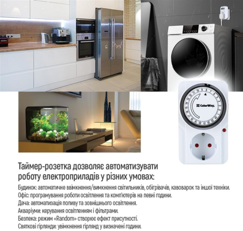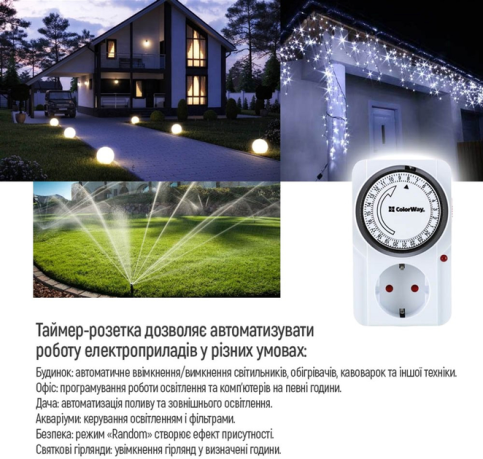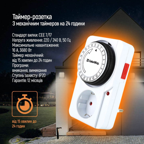 Ця розетка з механічним суточним таймером забезпечує автоматичне вмикання та вимикання електроприладів у заданий час протягом доби. Вона ідеально підходить для управління світильниками, побутовою технікою та іншими пристроями. Таймер допоможе автоматизувати різні процеси, такі як поливання рослин на дачі чи регулювання освітлення в акваріумі.