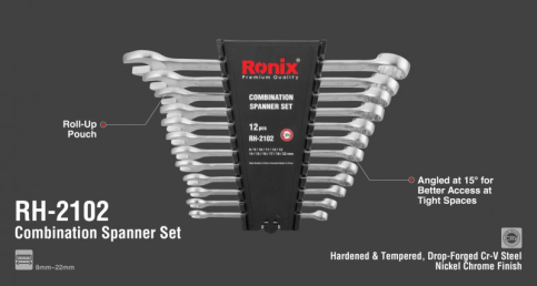 12 ключів у наборі Ronix RH-2102 мають тонку форму для оптимального доступу та виготовлені з кованої хромованадієвої сталі. Також додано нікель-хромове покриття для чудової корозійної стійкості.