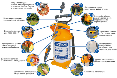 HoZelock Pulsar Plus 4312 - це багатофункціональний і ефективний напірний обприскувач для зовнішнього застосування, що володіє великою кількістю функцій. Ідеально підходить для садів середнього розміру, комфортний і безпечний у використанні. Регульоване сопло, дозувальна кришка і індикатор, технологія до останньої краплі, блокування включення / вимикання управління потоком, зберігання інструментів. Напірний обприскувач HoZelock 4311 Pulsar Plus 7 л + многорежимна форсунка "Multi Nuzzle" в комплекті.