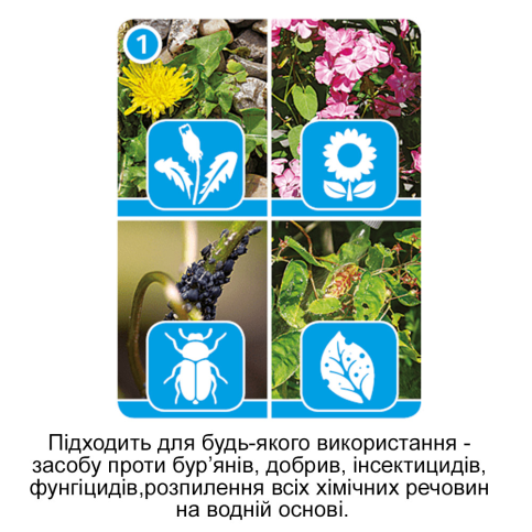 • Сопло з регулюванням подачі розчину від струменя до дрібнодисперсного розпилення «хмара». Дрібнодисперсні краплі легко проникають в структуру листа, що покращує засвоєння поживних речовин.