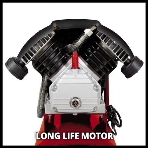 Компресор Einhell TC-AC 420/50/10 V необхідний для роботи в майстерні та гаражі: за потужності 2200 Вт він створює максимальний робочий тиск 10 барів. Для високої швидкості подавання повітря компресор має подвійний компресорний блок, а 50-літровий бак забезпечує велику кількість запасу повітря. Компресор обладнаний редуктором тиску для регулювання стисненого повітря до максимального робочого тиску 10 барів. Для регульованого робочого тиску і тиску в баку є один вбудований манометр і одна швидкознімна муфта. Рівень оливи можна перевірити в будь-який час через оглядове вікно. Для безпеки під час роботи компресор обладнаний зворотним клапаном і запобіжним клапаном. Einhell переконаний у високій якості матеріалу та забезпечує 10-річну гарантію на захист від іржі на бак. Зливний кран компресора забезпечує зручне обслуговування. Компресор надійний у роботі завдяки вібропоглинальним ніжкам, які забезпечують його надійну фіксацію. Для зручності транспортування є великі колеса та ручка для транспортування.