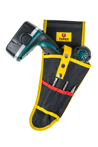 Кобура для свердла TOPEX виконана з міцного пластику, прикріпленого до ременя. Має 4 маленькі кишені для свердлів. Дозволяє носити свердло, має ремінець із застібкою, захищаючи інструмент від падіння з кобури. Бренд TOPEX призначений для домашніх майстрів.