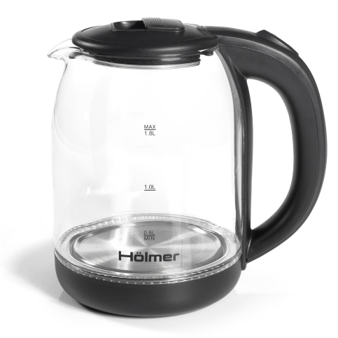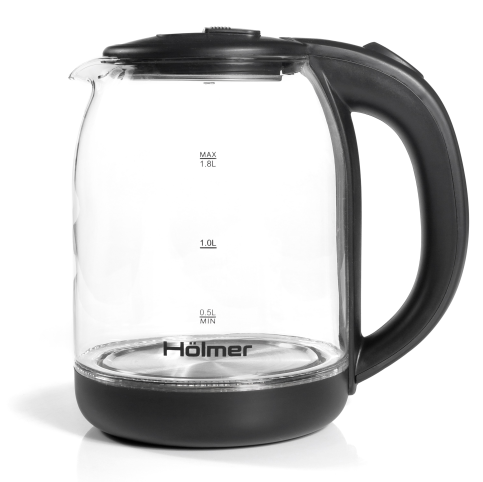 Чаша електрочайника HKS-1950 виготовлена з високоякісного термостійкого скла, об’єм складає 1.8 літра. Для зручного набору води або чищення, кришка відкривається під кутом понад 90°. Чайник Holmer HKS-1950 має чорний колір та матове покриття, а також LED – підсвічування яке сигналізує про роботу чайника та красиво і яскраво підсвічує воду блакитним кольором.