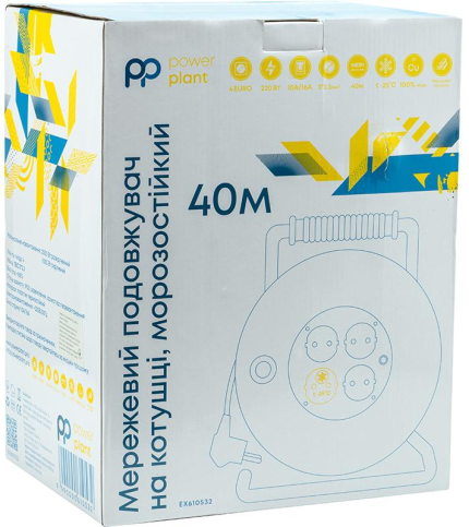 Подовжувач на котушці PowerPlant JY-20022/40 дає змогу під'єднувати пристрої в місцях, віддалених від стаціонарних розеток у побутових умовах експлуатації. Призначений для використання в електричній мережі 220 В, для живлення пристроїв з максимальною сумарною потужністю навантаження 3.5 кВт.