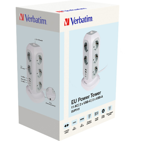 Вертикальний розгалужувач живлення Verbatim європейського стандарту забезпечує під'єднання 11 розеток змінного струму, 2 портів USB-C і 2 портів USB-A до однієї розетки європейського стандарту. Цей багатороз'ємний вертикальний розгалужувач обладнаний подовжувальним кабелем завдовжки 2 м, що дає змогу забезпечити постійне своєчасне заряджання та повноцінну роботу всіх ваших пристроїв.
