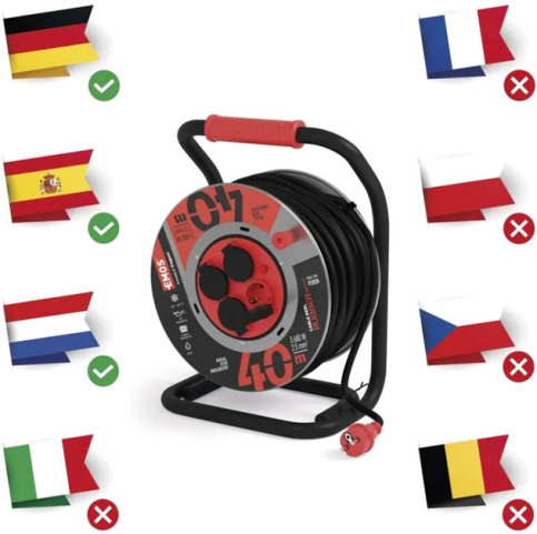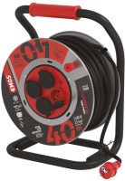 Подовжувач дозволяє підключати до чотирьох електричних пристроїв, а завдяки діаметру провідника 2.5 мм² кабель гума/неопрен витримує перевантаження до 3680 Вт (16 А) при повному розмотуванні. Великою перевагою є довжина 40 м, що дозволяє гнучко працювати без обмежень.