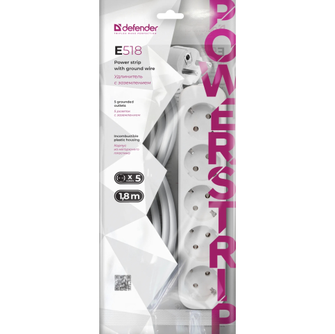 Подовжувач із заземленням Defender E518 довжиною 1.8 м на 5 розеток призначений для підведення електрики у важкодоступні місця та/або підключення до однієї розетки кількох пристроїв одночасно. Корпус виготовлений із негорючого пластику білого кольору.