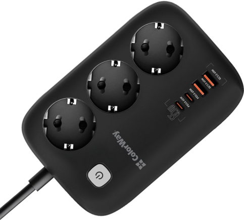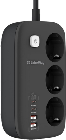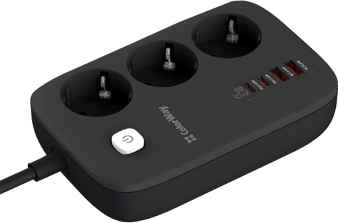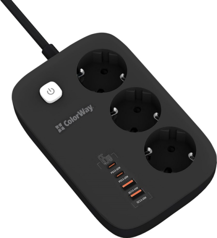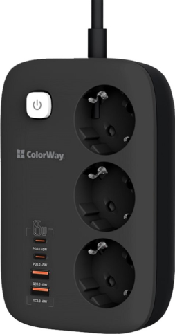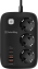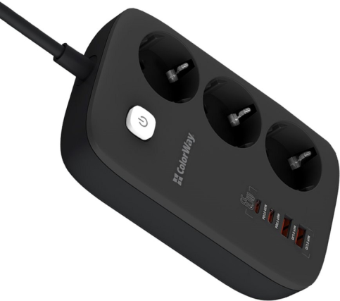 Компактний подовжувач з трьома розетками 220В і з 2 портами USB, що підтримують технологію швидкої зарядки Quick Charge 3.0/4.0, і 2 USB-C PD з підтримкою протоколів PD (Power Delivery) 2.0/3.0, 65W PPS; APPLE FAST CHARGE; SAMSUNG 5V-2A/AFC/SFC; QC2.0/3.0/4.0+; HUAWEI FCP/SCP, VOOC, XIAOMI 27W TURBO CHARGING. Пристрій має продуману конструкцію, що дозволяє одночасно підключати не тільки електроприлади, а й одночасно заряджати до чотирьох мобільних пристроїв без будь-яких труднощів. При цьому технологія інтелектуального контролю визначає та забезпечує оптимальну напругу для кожного девайсу, тоді як спеціальний чіп захищає від навантаження, короткого замикання чи перегріву. Зарядний пристрій відноситься до нового покоління, в якому замість кремнієвих транзисторів використовують нітрид галію. Завдяки цьому зарядка практично не нагрівається, споживає менше енергії і заряджає гаджети швидше за звичайні адаптери живлення. Максимальної потужності 65 Вт вистачить, щоб виробляти підзарядку не лише невеликих гаджетів, а й таких енергоємних пристроїв, як ноутбуки. Подовжувач оснащений захисними шторками за технологією Child Security Door, а також із зручною кнопкою включення та вимикання та LED індикацією. Контактні групи розеток виготовлені з високоякісного мідного сплаву. Корпус виконаний із жароміцного пластику, здатного витримати температуру до 750°C.