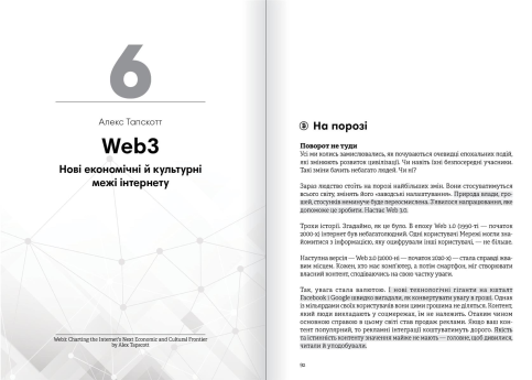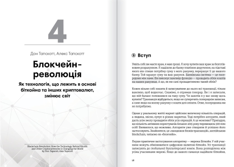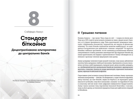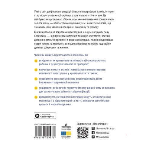 Уявіть світ, де фінансові операції більше не потребують банків, інтернет стає місцем справжньої свободи, а дані належать тільки вам. Це майбутнє, яке розкриває збірник, присвячений питанням криптовалюти та блокчейну, — багатогранний путівник у світ нових технологій, що змінюють наші уявлення про гроші, економіку та свободу. Книжка наповнена яскравими прикладами, що демонструють силу блокчейну, — від пірингових платежів до смарт-контрактів, здатних докорінно змінити юридичні й фінансові операції. Кожен розділ подає новий погляд на майбутнє, де людина повертає контроль над своїми даними, фінансами та життям. Аудіокнига в подарунок! Придбавши паперову книжку, ви отримуєте в подарунок аудіоверсію, яку можна скачати на сайті через промокод, що розміщений на титульній сторінці паперового видання.
