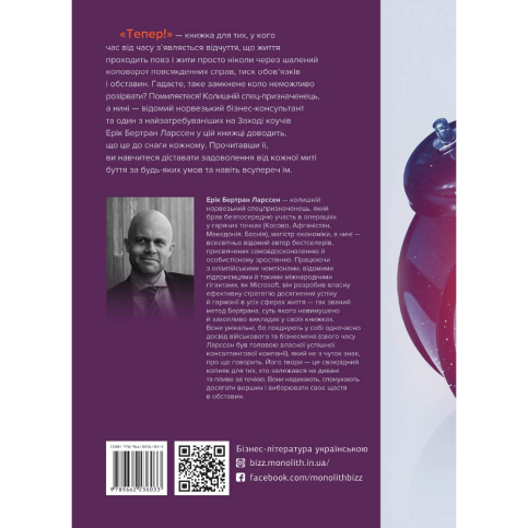 «Тепер!» — книжка для тих, у кого час від часу з’являється відчуття, що життя проходить повз і жити просто ніколи через шалений коловорот повсякденних справ, тиск обов’язків і обставин. Гадаєте, таке замкнене коло неможливо розірвати? Помиляєтеся! Колишній спецпризначенець, а нині — відомий норвезький бізнес-консультант та один з найзатребуваніших на Заході коучів Ерік Бертран Ларссен у цій книжці доводить, що це до снаги кожному. Прочитавши її, ви навчитеся діставати задоволення від кожної миті буття за будь-яких умов та навіть всупереч їм. Якщо у попередній книжці — «Пекельний тиждень» — автор відповідав на запитання «Що робити?» та «Як робити?» задля досягнення успіху, то у цій зосереджується на тому, як, прямуючи до мети, насолоджуватися «подорожжю». Разом вони дають найповніше уявлення про «метод Бертрана», розробці якого він присвятив майже десятиліття, та запускають ланцюгову реакцію. Адже для впровадження позитивних змін, для того, щоб діяти відповідно до плану, незважаючи на численні труднощі, щоб змінювати на краще зовнішні обставини, потрібно змінитися зсередини, віднайти у собі внутрішню силу, яка дасть відчуття гармонії, спокою та щастя. Ерік Ларссен упевнений, що силу духу можна тренувати так само, як і тіло, та дає відповідні настанови. Врешті ця сила допоможе звільнитися від стресу й тотальної заклопотаності, досягти «ефекту присутності» у своєму житті, перебувати «тут і тепер», а не у минулому чи майбутньому, тобто жити у дійсності. «Тепер!» — це така собі книжка-медитація, що багато в чому перегукується з буддійською філософією. У ній Ларссен показує вихід з «колеса сансари», у якому ми крутимося, наче білки, та запрошує у захопливу подорож справжнім життям.