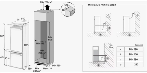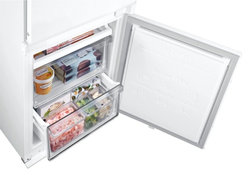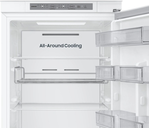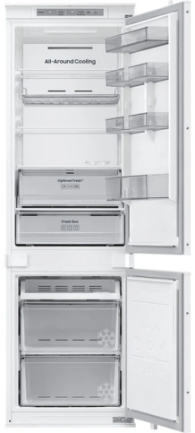 Вбудований холодильник SAMSUNG BRB70F26C1S0UA поєднує елегантний дизайн та сучасні технології для забезпечення свіжості ваших продуктів. Загальний корисний об'єм складає 267 літрів, з яких 190 літрів припадає на холодильне відділення та 74 літри — на морозильні. Технологія No Frost запобігає утворенню льоду та інею, спрощуючи догляд за приладом. Система All-Around Cooling забезпечує рівномірне охолодження кожної полиці, підтримуючи оптимальну температуру у всьому холодильнику. Пристрій працює тихо, з рівнем шуму до 35 дБ, що створює комфортну атмосферу на кухні. Завдяки високому класу енергоефективності A++ холодильник споживає мінімум електроенергії. Компактні розміри (висота — 177.5 см, ширина — 54 см, глибина — 55 см) дозволяють легко інтегрувати його у кухонні меблі.