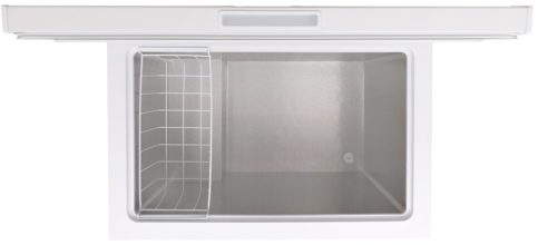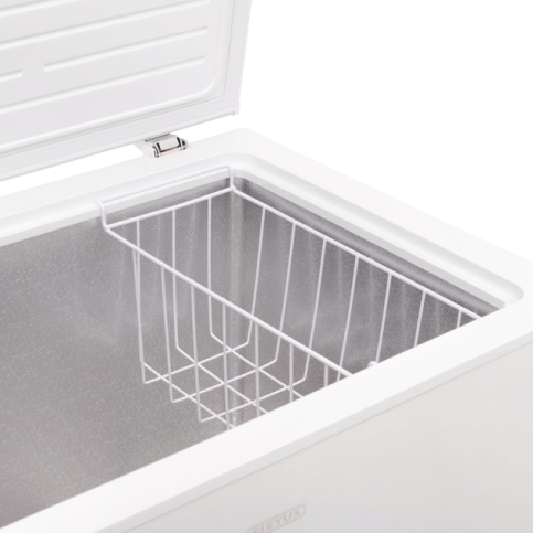 У металевому кошику зручно зберігати невеликі упаковки, щоб не марнувати час на пошуки потрібних продуктів. Його можна переміщувати або повністю зняти, щоб максимально використовувати внутрішній об’єм скрині – зберігати готові страви, заготовлювати ягоди і зелень, заморожувати великі шматки м’яса, птиці та риби.