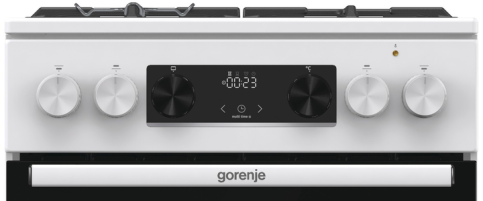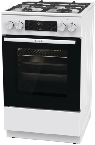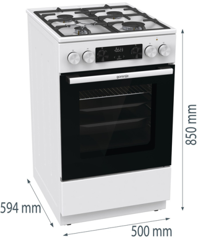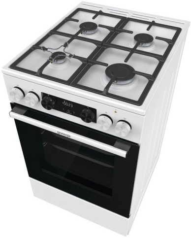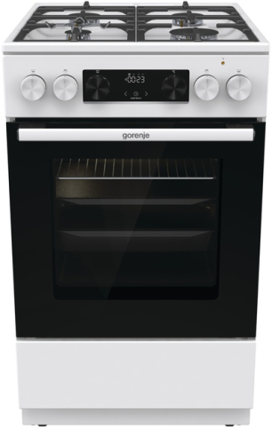 Плита комбінована Gorenje GK5C43WF — це стильне та функціональне рішення для вашої кухні. Завдяки поєднанню газової варильної поверхні та електричної духовки, цей прилад забезпечує максимальну зручність у використанні. Варильна поверхня обладнана чотирма конфорками, включаючи додаткову та велику конфорку, що дозволяє ефективно готувати страви різних типів. Конфорки мають різну потужність: ліва передня — 1 кВт, права передня — 3 кВт, ліва задня — 1.9 кВт, права задня — 1.9 кВт. SoftClose шарнір забезпечує плавне закриття дверцят духовки, а унікальна форма Homemade створює оптимальні умови для випікання. Духовка оснащена електронним програматором IconLed, що полегшує налаштування приготування страв.