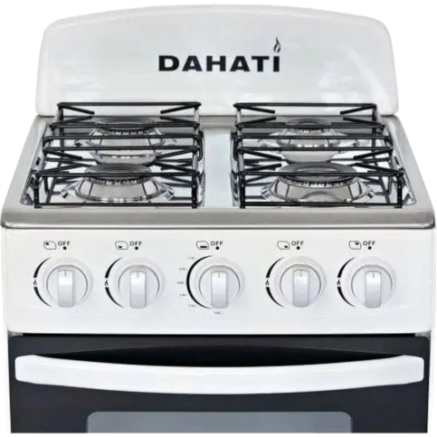 Плита газова DAHATI 2000-02 має газову робочу поверхню та газову духовку. Робоча варильна поверхня – нержавіюча сталь. Плита виконана в білому емальованому корпусі – класичний колір та легкий догляд для Вашої кухні. На передній панелі розташовані перемикачі регулювання потужності полум'я пальників робочої поверхні та духовки.