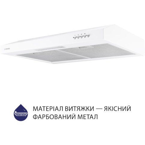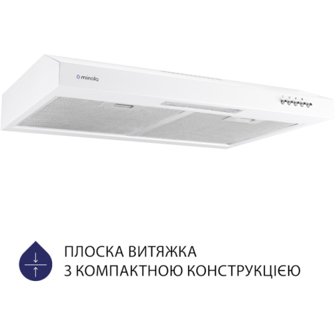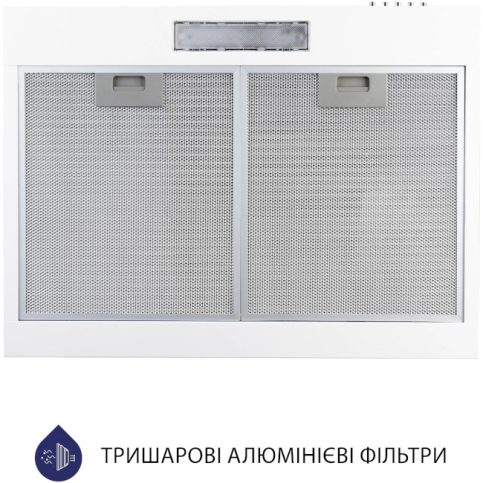 Кухонна витяжка Minola HPL 612 WH обладнана двома захисними алюмінієвими жировими фільтрами. Вони виготовлені з декількох шарів алюмінієвої сітки, що забезпечує надійний захист двигуна та інших деталей від потрапляння жиру та бруду. Очищення алюмінієвих фільтрів слід проводити кожні 2-3 місяці вручну в мильному розчині або в посудомийній машині.