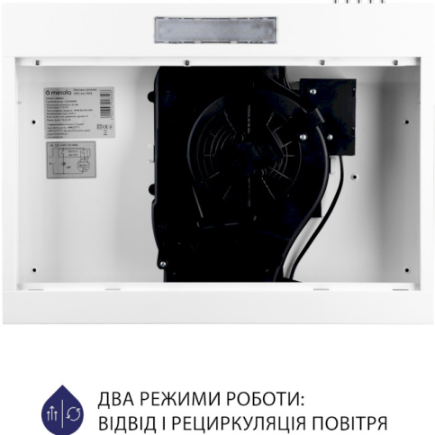 Плоска кухонна витяжка Minola HPL 612 WH обладнана одним двигуном потужністю 80 Вт. Максимальна продуктивність пристрою в режимі відведення повітря становить 450 м³/год, що дає змогу ефективно видаляти випаровування, небажані запахи та кіптяву, які утворюються в процесі приготування їжі.