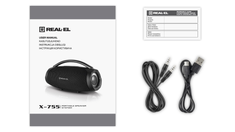 REAL-EL X-755 — це портативна акустична система потужністю 70 Вт. Вона оснащена динаміками, які забезпечують глибокий бас, яскраву середину та чіткі високі частоти для неймовірного захоплюючого звучання. Ідеальна як для домашніх тусовок, так і для вечірок на природі — бери її з собою куди завгодно. Підключай смартфон через Bluetooth, вставляй флешку або карту пам’яті, використовуй AUX — ти завжди маєш вибір, як слухати улюблену музику. А якщо хочеш ще більше звуку — активуй режим TWS, об’єднай дві колонки в одну бездротову 140 Вт стереосистему. RGB-підсвічування навколо динаміків та по боках робить атмосферу ще яскравішою — справжнє шоу в кожному треку. Мікрофонний вхід з регулюванням гучності та ефектом ехо перетворюють X-755 на чудове рішення для караоке, ведення заходів або голосових анонсів. Колонка працює до 10 годин автономно завдяки акумулятору 33.3 Вт/г, заряджається через USB Type-C. REAL-EL X-755 — звук, що заряджає кожну мить.
