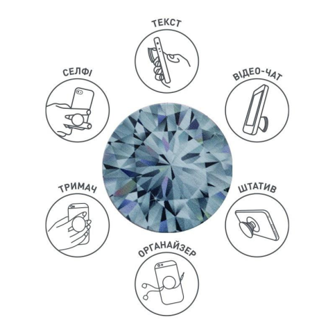 Забезпечує надійне зчеплення, щоб ви могли надсилати текстові повідомлення однією рукою, знімати кращі фотографії та переглядати відео. Функціонує як зручна підставка, завдяки якій ви можете переглядати відео. Використовуйте, як штатив для найкращих селфі або відео-конференції. Надійна липучка 3М приклеюється до більшості пристроїв та чохлів. Розміри: діаметр 39,74 мм х 7 мм і 24,25 мм в розкладеному вигляді.