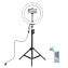 Штатив: 1. Виготовлений з високоякісної алюмінієвої трубки, надійний і міцний. 2. Компактні ніжки штатива можна скласти, зробивши їх досить маленькими для зручного перенесення. 3. Відрегулюйте висоту штатива, відрегулювати центральну вісь у відповідності з різними концепціями зйомки. 4. Підходить для мобільних телефонів, планшетів, спортивних камер, DV-камер та ін. 5. Легкий і портативний дизайн: зручно використовувати для подорожей або роботи на відкритому повітрі і т. Д. 6. Висота в складеному вигляді: 49,5 см ; в розкладеному вигляді: 1,1 м. Світлодіодне кільце: 1. Світлодіодний кільцевої світильник можна встановити на тримач і взяти з собою куди завгодно, його також можна зняти зі стійки в будь-який час, кульова головка штатива може обертатися на 360 градусів і може вільно регулюватися під будь-яким кутом (держатель не входить в комплект). 2. Кільцевій світильник виготовлений з 46 енергозберігаючих світлодіодів. Він відмінно розсіює тепло, володіє постійним струмом і високою передачею кольору, пом'якшує джерело світла і підвищує тон шкіри при зйомці портретів. 3. Режим RGB дозволить легко налаштувати колір і яскравість, ідеальна яскравість може бути досягнута без установки додаткових барвистих фільтрів. Різні кольори м'якого природного світла висвітлюють вашу красу в різних умовах. 4. Широке застосування: широко застосовується дляосвещенія на вулиці, в приміщенні, для зйомки портрета, рекламної фотографії, візаж / макіяж, зйомки відео і т.д. 5. Легкий і портативний дизайн: зручно використовувати і носити з собою, коли ви подорожуєте або працюєте на вулиці і т. Д. 6. Зажим телефону підходить для мобільного телефону шириною 6-8,5 см. Технічні характеристики: Світлодіоди: 46 шт. SMD 5050 RGBW Потужність: 15Вт (USB 5V / 3A) Режим роботи: RGB + White Режими управління: Bluetooth APP, пульт дистанційного керування Режими дистанційного керування: 20 статичних квітів і 6 динамічних квітів Режим роботи з ПО: Режим настройки кольору, режим музики, режим голосового управління, режим таймера ділянка дистанційного управління: 5-10 м Метод сигналу: інфрачервона радіочастота Колір: - Червоний: довжина хвилі 620-625 нм, світловий потік 600 мкд / лм - Зелений: довжина хвилі 520-525 нм, світловий потік тисячу мкд / лм - Синій: довжина хвилі 460-465 нм, світловий потік 400 мкд / лм - Білий: колірна температура 6000-6500k Розмір світлодіодного кільця: 30х30 см (30х35 см з кріпленням) Вага в упаковці: 1,32 кг Гарантія: 12 місяців Комплектація: Кільцевій світло з кріпленням для телефону Штатив Пульт дистанційного керування