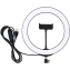 Кількість світлодіодів: 80 шт. Тип світлодіодів: 2835 Яскравість лампи: 24-26 lm Колірна температура білого світла: 6500K Температура теплого білого кольору: 3200K Потужність: 0,1-10W Напруга: 5V Індекс передачі кольору: Ra> 90 Діапазон затемнення: 1% -100% Матеріал: пластик ABS, акрил Розміри: зовнішній діаметр 260 мм, внутрішній діаметр 210 мм Харчування: USB Довжина кабелю: 2 м Кріплення для телефону: 6-8,5 см Розмір світлодіодного кільця: 26х26х15 см (26х30.7 см з кріпленням) Вага: 443 г