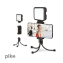 Комплект блогера Piko Vlogging Kit PVK-02L, що складається з 5" настільного гнучкого трипода з тримачем для смартфона. Чутливість 20 дБ. LED-підсвітка білого світла (36 точок LED, 650K, >600Lux). Живлення від АА-батарейок. Кнопка дистанційного керування смартфоном Bluetooth.