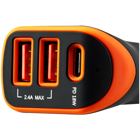 Тип - адаптер, Живлення - прикурювач автомобіля, Призначення - універсальне, тип вихідного підключення - USB Type-C, USB, Max - 2.4 А, кількість USB портів - 2 x USB, 1 x USB Type C, швидка зарядка - Power Delivery, Intellicharge, чорний, помаранчевий