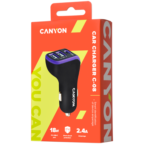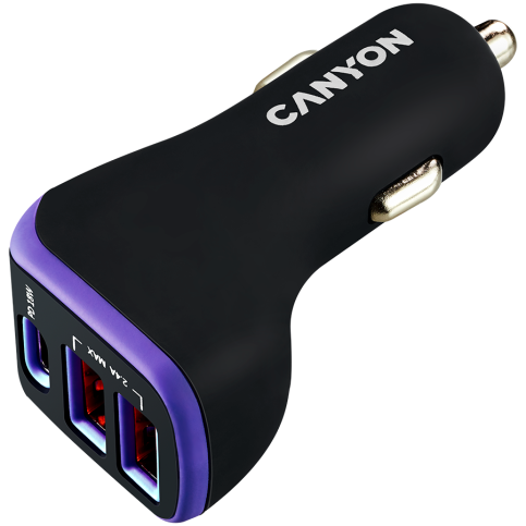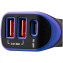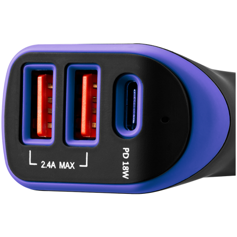Тип - адаптер, Живлення - прикурювач автомобіля, Призначення - універсальне, тип вихідного підключення - USB Type-C, USB, Max - 2.4 А, кількість USB портів - 2 x USB, 1 x USB Type C, швидка зарядка - Power Delivery, Intellicharge, фіолетовий, чорний