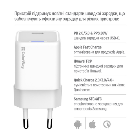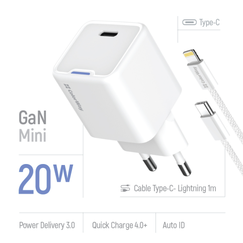 ColorWay GaN Mini 20W PD Port PPS USB-C White (CW-CHS059PD-WT) + кабель