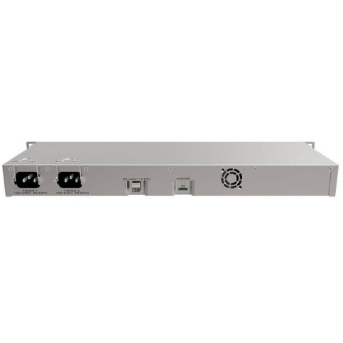 MikroTik RB1100AHx4 Dude Edition (модель RB1100Dx4) - це гігабітний роутер на 13 Ethernet портів. Його використовують в мережах з кількістю абонентів понад 100 осіб, а також для побудови швидкісних VPN каналів. В даному маршрутизаторі встановлено SSD диск на 60Гб, що дозволяє його повноцінно використовувати в якості сервера The Dude. Це дуже зручний інструмент системного адміністратора. The Dude сервер дозволяє скласти карту мережі, моніторити пристрою в ній і повідомляти про збої. Пропускна здатність всіх портів в повному дуплексі до 7,5 Гбіт / с. Роутер підтримує апаратне шифрування IPsec зі швидкістю 2.2 Гбіт / с з шифруванням AES128. Операційна система: RouterOS Level 6 license Ззаду корпусу RB1100AHx4 розташовані два роз’єми для подачі живлення 220В, роз’єм DC telecom для подачі живлення з постійною напругою 20-57В (підтримується 48В) і слот microSD. Два роз’єму 220В призначені для подачі резервного живлення на роутер в разі, якщо воно пропаде на одній з ліній. Роз’єм живлення DC telecom можна використовувати, наприклад, для підключення акумуляторної батареї. Роутер також можна живити за технологією PoE через мережевий порт Eth13. Підтримується напруга 20-57В і стандарти 802.3af / at і Passive PoE.