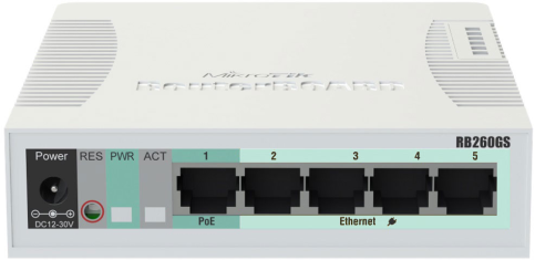 Mikrotik RB260GS, 5 Gigabit ports and SFP cage, SwOS, plastic case, PSU