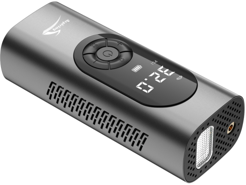 - Багатофункціональний повітряний компресор внаслідок розмірів можна носити з собою, він має тривалий час автономної роботи, цифровий дисплей LCD, рівень шуму до 75 децибел, циркуляційна система охолодження, зручні кнопки і просте управління.