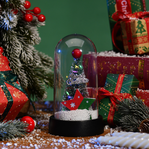 Ця витончена ялинка в колбі з яскравою зіркою і LED підсвічуванням відмінно підійде для створення затишної атмосфери у вашому будинку або офісі. Її компактний розмір 15х9см дасть змогу прикрасити будь-яку поверхню, а живлення від трьох батарейок типу АА забезпечить тривале та зручне використання без необхідності зовнішнього підключення до електромережі.